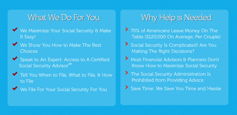 While my wife and I had read about file & suspend, I had no idea when or how until chatting with my Advisor and receiving the information he sent. The extra money will give us some options we wouldn't have had. -Jack & Patricia K.