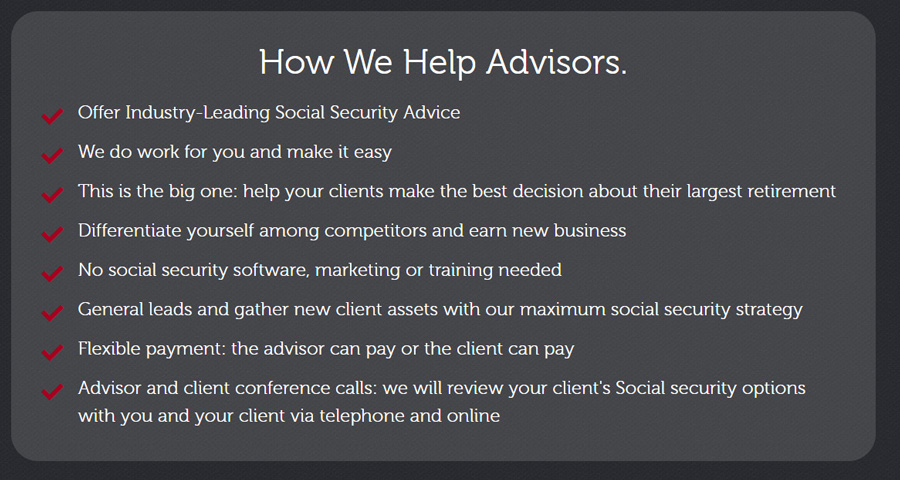Step 2: Offer our signature product, the Maximum Social Security Strategy, to your clients and help them maximize their Social Security benefits. All of your sales are carefully tracked through your own customized referral code or your own co-branded website.